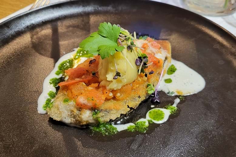 gebackene Aubergine mit Weißweinsauce, Knoblauch-Tomaten und Oliven-Kartoffelpüree